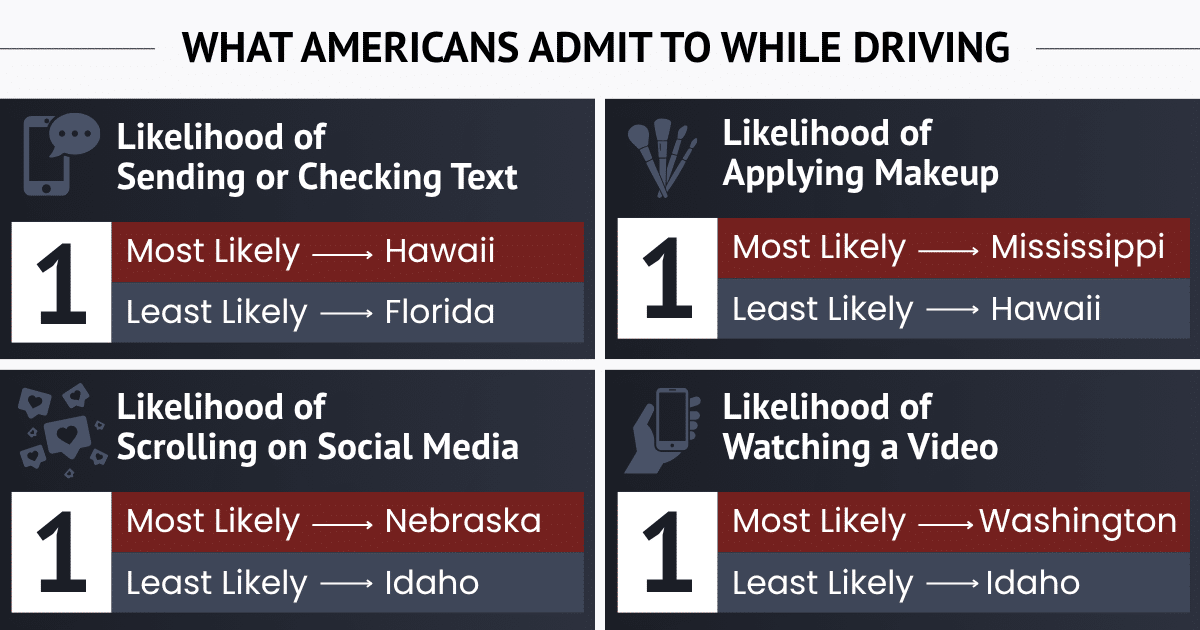 - Mississippi tops the list for applying makeup while driving. Hawaii ranks lowest for that one.